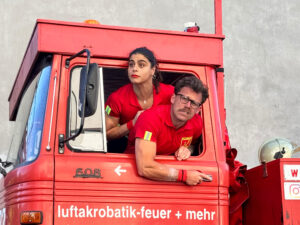 Nehmen Sie teil an einem ungewöhnlichen Lehrgang der absolut einmaligen FeuerWer? Mit viel Charme und Witz leitet das Duo durch die verschiedenen Lektionen der Show und verblüfft immer wieder mit außergewöhnlicher Akrobatik. Das historische Feuerwehrfahrzeug (ein Mercedes-Oldtimer aus den 1970er-Jahren, Modell LP 608 mit Drehleiter) wird zur Bühne, ein Feuerwehrschlauch zum Drahtseil. Hoch oben an der Drehleiter hängt das Trapez. Helfen Sie mit bei einer spektakulären Löschübung und werden Sie Augenzeuge atemberaubender Luftakrobatik. Eine einzigartige Straßenshow mit Humor und Herz, bei der mit Sicherheit nichts anbrennt! Oder doch? Eintritt frei.
